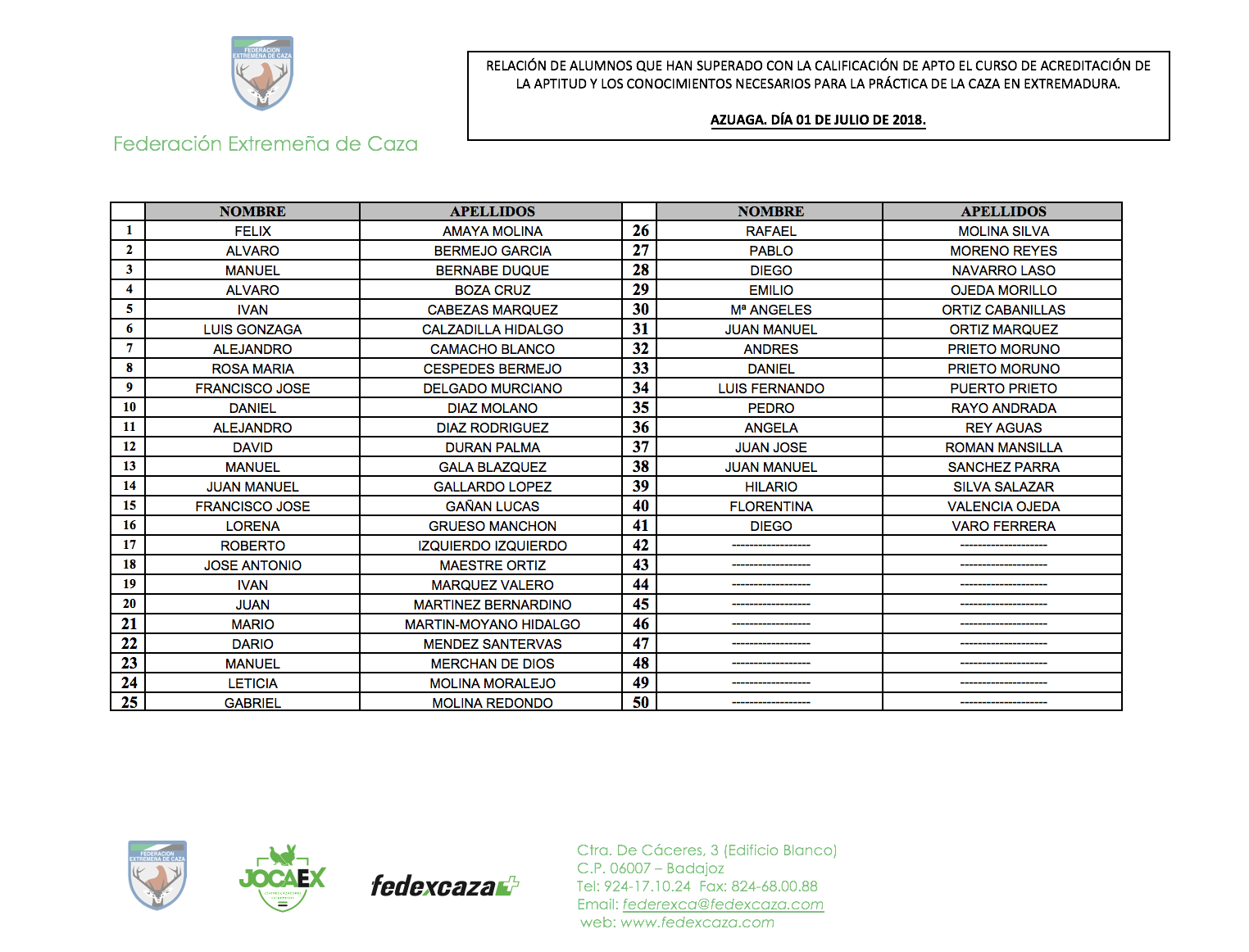 Relación de alumnos que han superado con la calificación de aptos el curso de acreditación de la aptitud y el conocimiento necesario para el ejercicio de la caza en Extremadura. AZUAGA. 1 de julio de 2018. Lista corregida