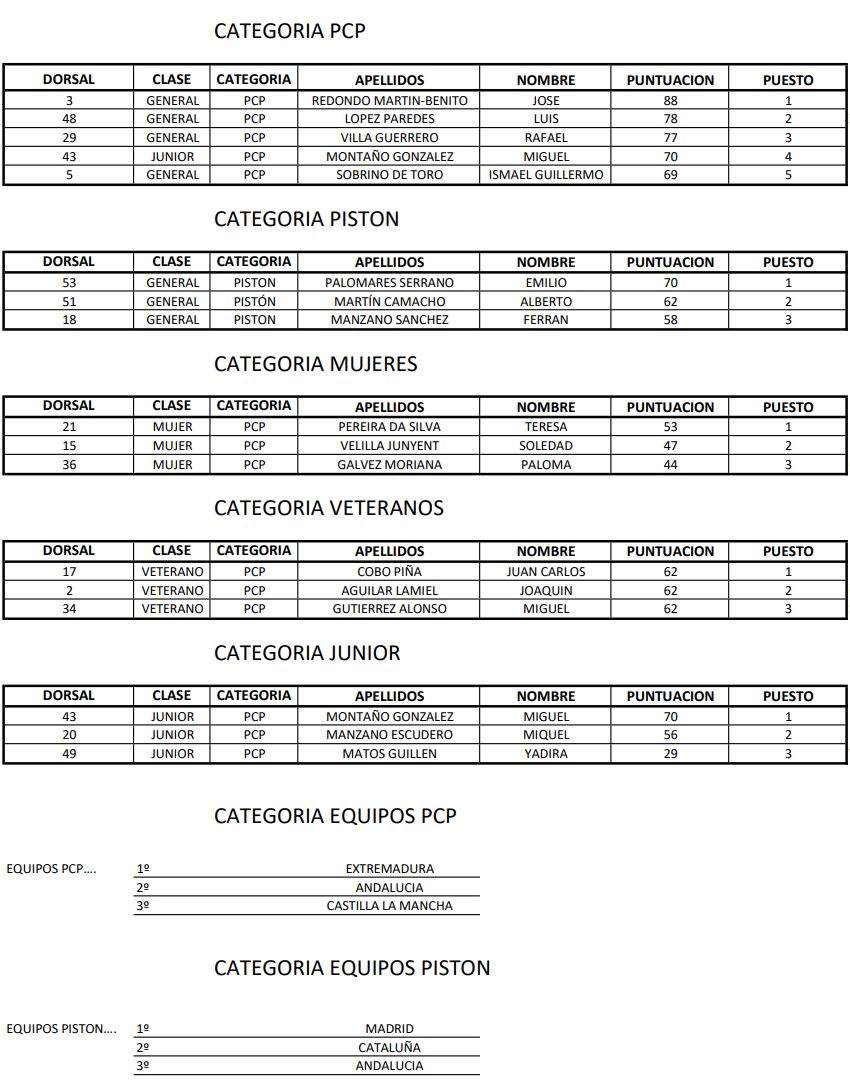 Además, el equipo de Extremadura se alzó como campeón de España por equipos en la categoría PCP, con un total de 221 puntos. El equipo estuvo compuesto por Antonio Suárez Bohega, Serafín Zamora Tapia, Miguel Montaño González, Francisco Javier Prada Mansilla, Elio Matos Márquez y Luis López Paredes.